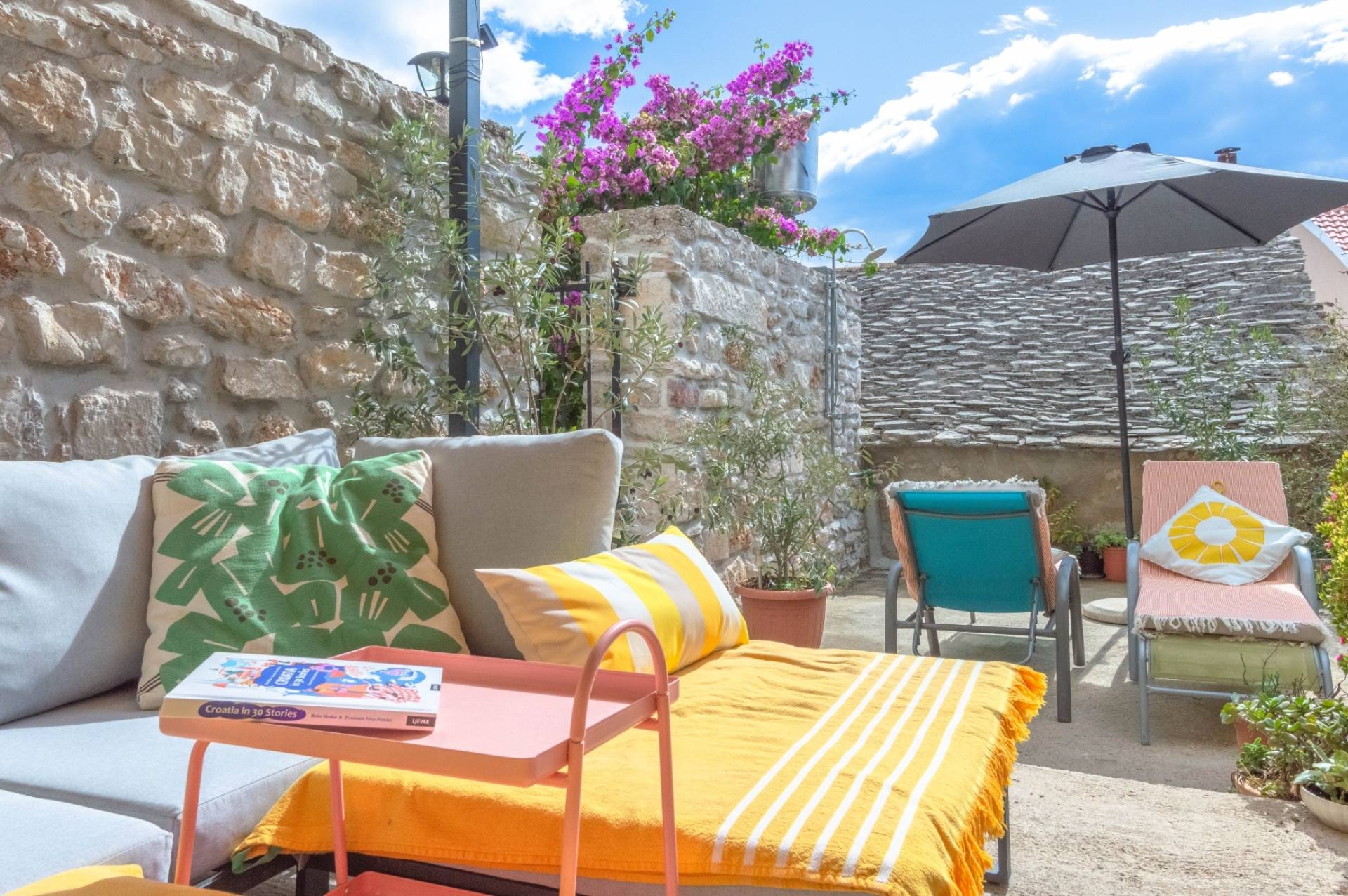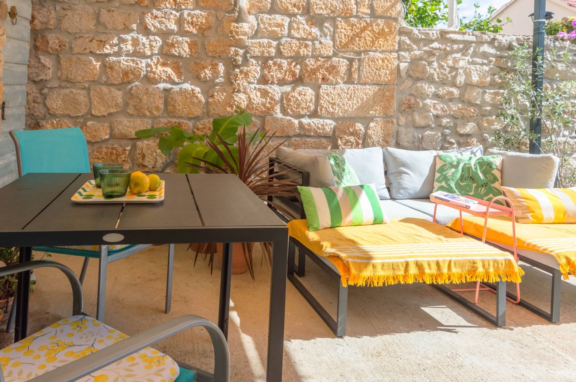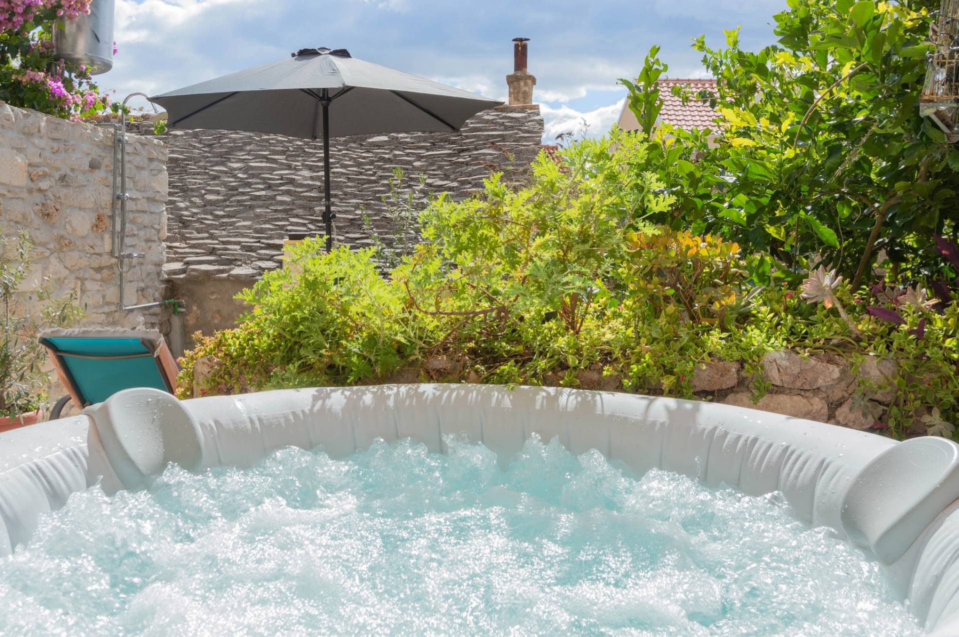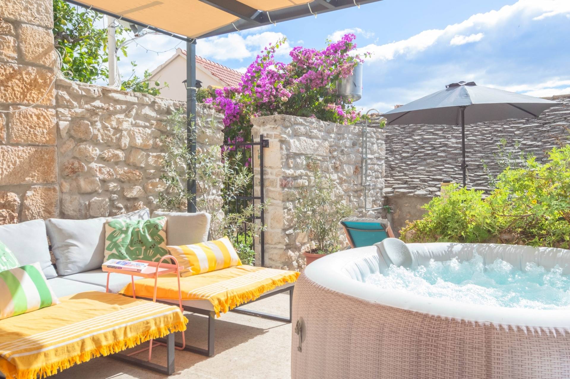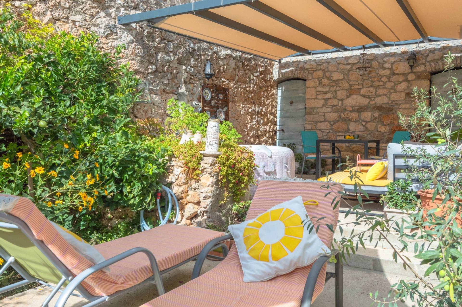 Enjoy the tranquility of the secluded garden, lemon tree, and private outdoor space, making it the perfect getaway to unwind and connect with nature. Apartment is on the ground floor with its own patio garden featuring a jacuzzi, solar shower, lounge beds and two dining areas. A peaceful oasis perfect for couples seeking relaxation in the heart of Bol.