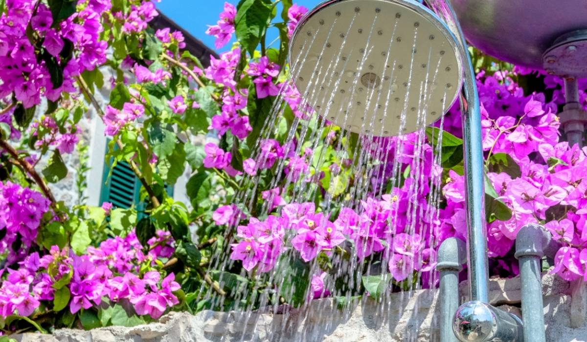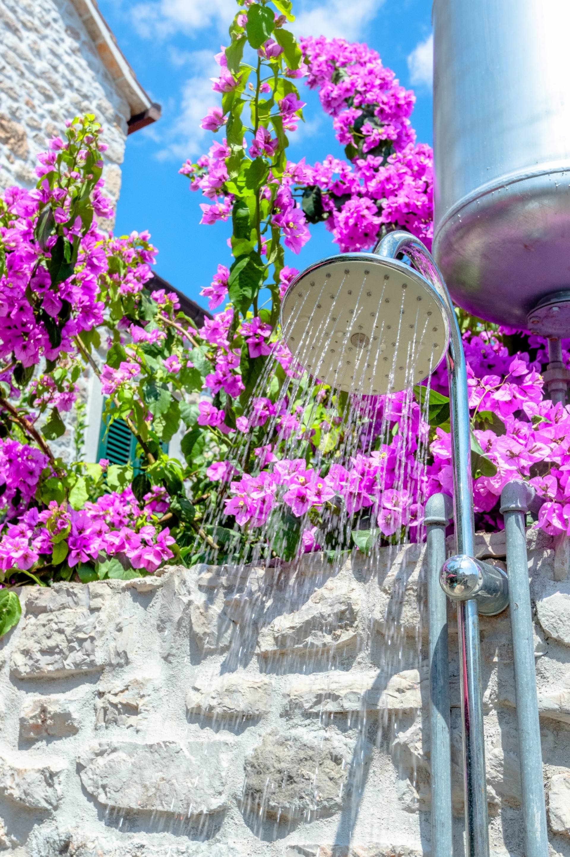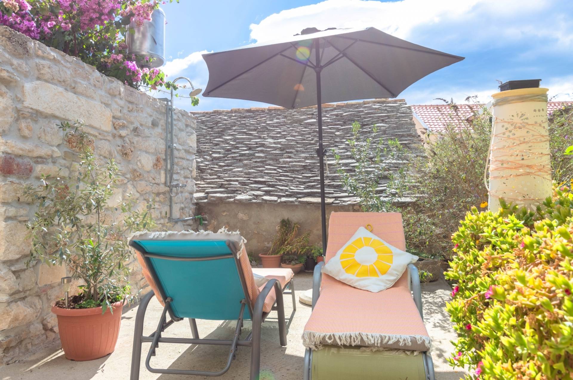 Open studio layout with a beautiful private garden as a perk, outdoor dining area, lounge furniture, jacuzzi and solar shower